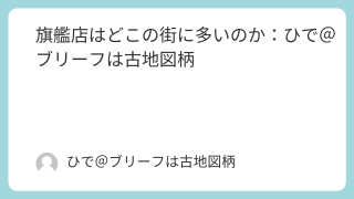 その他 旗艦店はどこの街に多いのか:ひで@ブリーフは古地図柄 慌ただしく新期が始まりました。地図制作部の編集グループへ異動となり、心機一転頑張っていく所存ですので宜しくお願いいたします。さて、今回のブログテーマは「旗艦店はどこの街に多いのか」。旗艦店とはフラッグショップとも呼ばれるブランドを代表する中... 2015.06.04 2025.10.27 ひで@ブリーフは古地図柄 その他地図